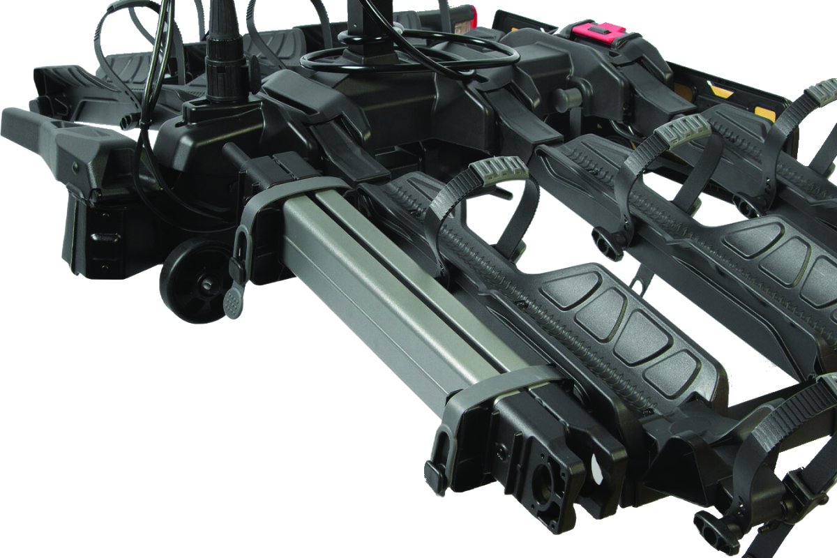 Univerzális szállító vonóhorogra, amely akár három kerékpár biztonságos szállítását teszi lehetővé, beleértve az e-bike-okat és a nehezebb modelleket is (max. 30 kg kerékpáronként, teljes teherbírás 60 kg). A dönthető funkciónak köszönhetően könnyű hozzáférést biztosít a csomagtartóhoz, még rögzített kerékpárokkal is. Az integrált rakodó rámpa megkönnyíti a rakodást, a stabilizáló rendszer és a kiváló minőségű reteszelő mechanizmusok pedig vezetés közbeni biztonságról gondoskodnak.